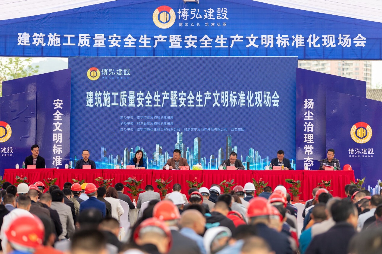 4月11日,由遂寧市住房和城鄉(xiāng)建設(shè)局主辦,射洪縣住房和城鄉(xiāng)建設(shè)局協(xié)辦的“2019年全市建筑施工質(zhì)量安全生產(chǎn)暨安全生產(chǎn)文明施工標(biāo)準(zhǔn)化觀摩會”,由射洪馨寧公司開發(fā)、遂寧市博弘建設(shè)工程有限公司(以下簡稱博弘建司)承建的“正黃·金域香江”項(xiàng)目施工現(xiàn)場順利召開。遂寧市住建局黨委書記敬茂軍、射洪縣副縣長鄒清、射洪縣住建局局長王彬、遂寧市質(zhì)量安全監(jiān)督站站長周杰等相關(guān)領(lǐng)導(dǎo)親臨現(xiàn)場并做重要講話,全市二級以上施工單位共700多名同行參加了此次觀摩會。